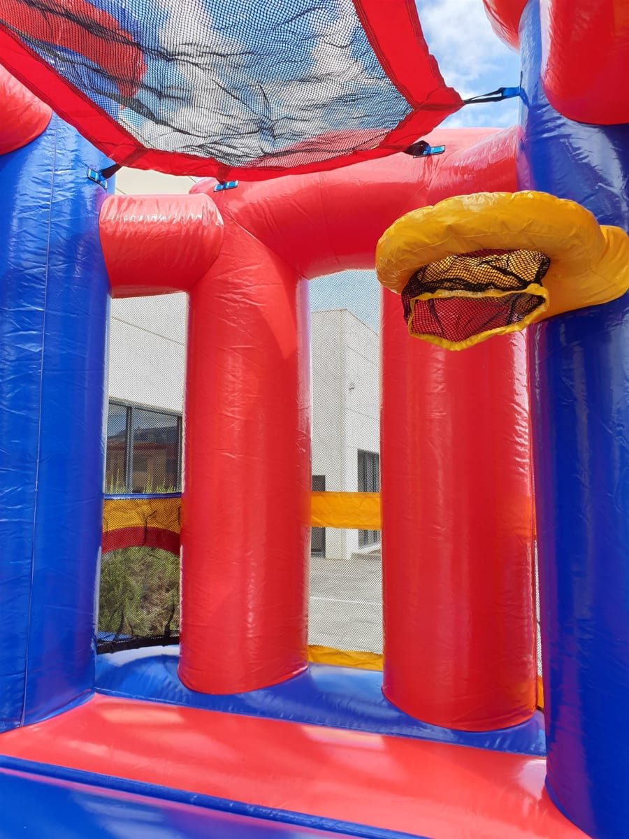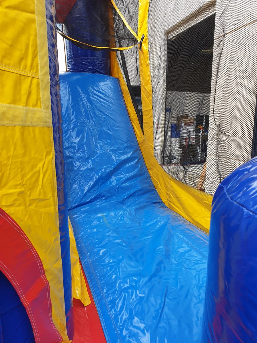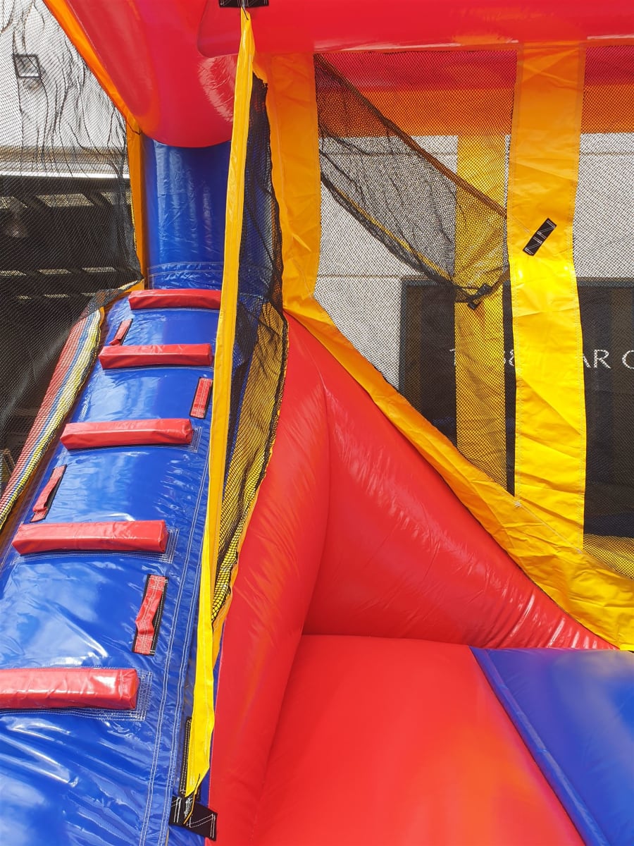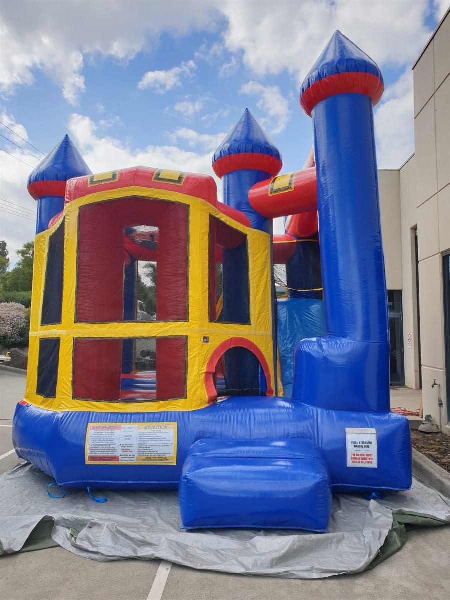 The Backyard Combo Jumping Castle is perfect for even the smallest of areas, measuring just 4.5m wide, 5.5m long but still a commanding 5m high, it demands attention. Featuring bright generic colours, a basketball ring and small slide, this jumping castle has got it all. Supervise the action with ease thanks to the high visibility mesh sides.