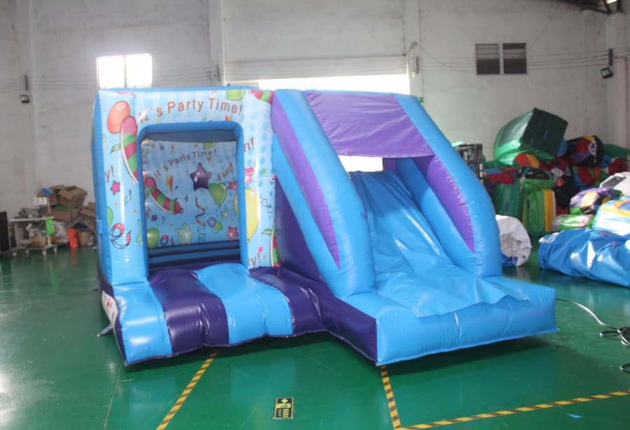 This cool little combo jumping castle is brand new featuring generic theming with balloons, solid walls and a small slide out the front. The Low Box Jump and Slide Combo is 5.5m deep 4m wide and just 2.5m high meaning it's perfect to go indoors, in a large garage or under a big pergola.
