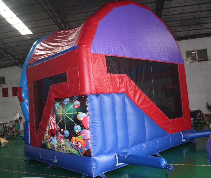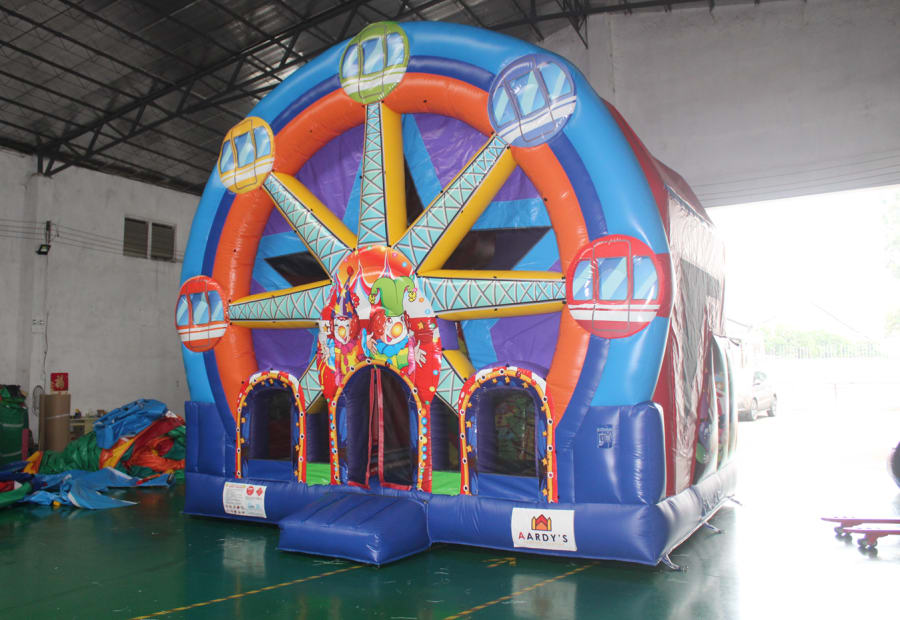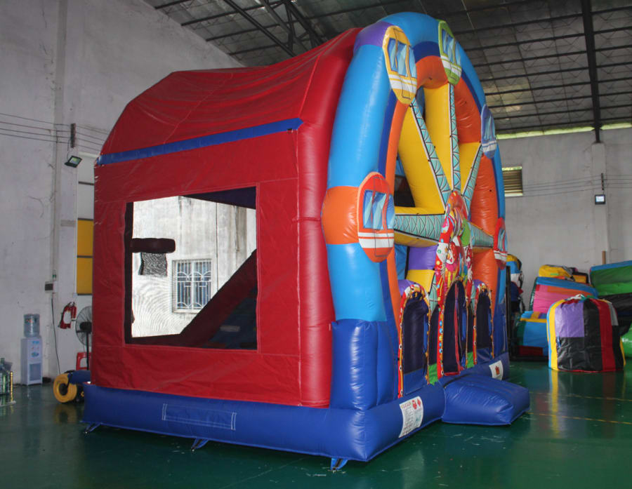 Check out our new Ferris Wheel Jumping Castle combo! A real eye catching design with awesome theming, a slide, popups and basketball hoop.